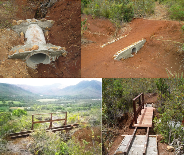 Depuis le début de la semaine une équipe construit en atelier, les ouvrages (2 potences de panneaux et 2 ponceaux) qui seront installés sur le parcourt des sentiers du Mont Goumba. Les ponceaux ont été posés hier dans la journée. Le platelage des ponceaux et un passage busé ont été réalisés ce matin (cf.photos ci-dessus).